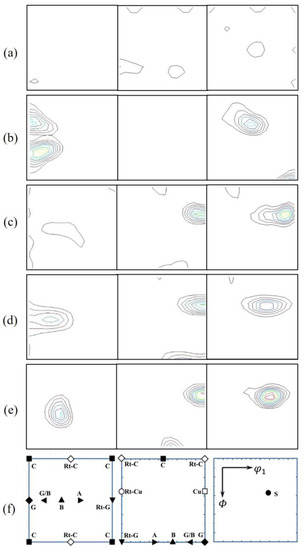 For FCC materials, there are mainly two basic textures: copper texture and brass texture [19,20]. The ODF diagram of the Cu-Ni-Cr alloy at 0°, 45°, and 65° sections under different rolling strains is shown in Figure 8, and the typical preferential orientation of the rolled FCC metal is shown in Figure 8f [11]. The evolution of the internal texture of the alloy with an increase in the reduction rate can be obtained from the ODF diagram. In Figure 8a, after solution treatment, the texture strength of the Cu-Ni-Cr alloy is weak, and the texture distribution is almost random. After cold rolling, as shown in Figure 8b, a strong S texture {123} <634> is formed; the copper texture and brass texture were generated when the rolling strain reached 3.2. The copper texture increases rapidly to a higher degree and the texture of brass increases slowly. When the rolling strain reached 4.3, the copper texture, brass texture, and S texture all reached their maximum values, and the texture density significantly increased.