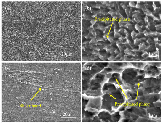 To further study the effects of the thermo-mechanical treatment process on the internal microstructure deformation and aging precipitation behavior of the Cu-Ni-Cr alloy, the microstructure of the solid solution state and aging state alloy was observed by SEM and TEM. Figure 9 shows the microstructure of the aging alloy at different rolling strains observed by SEM. After the cold rolling and aging treatments of the alloy, when the rolling strain is 3.2, the grain is obviously compressed and elongated, as shown in Figure 9a. With an increase of the reduction rate, when the reduction rate reaches 4.3, obvious shear bands appear parallel to the rolling direction, as shown in Figure 9c, and an obvious directionality of the grains appears. In Figure 9b,d, there are sparse white precipitates on the grain surface with a uniform distribution. In Figure 9d, many small precipitates are uniformly distributed in the shear zone. Compared with the precipitates in Figure 9b, the precipitates are more densely distributed in the shear zone. In conclusion, the cold rolling reduction rate has a significant effect on the microstructure and precipitation behavior of the Cu-Ni-Cr aged alloy. Due to the large deformation in the cold rolling process, a fiber structure and shear band formed in the alloy, and these structures could be used as nucleation points to promote the generation of the second phase precipitation. With an increase of the cold rolling reduction rate, the shear band in the alloy increases, which further promotes the precipitates.