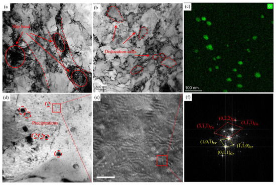 When the rolling strain of cold rolling is further increased to 4.3, more dislocation cells are found in the matrix, and the dislocation cells produced are smaller. When the cold rolling strain is further increased to 4.3, the accumulation of the alloy reduction rate increases, the sliding deformation is difficult, and a lot of shear deformation occurs in the grain. After the aging treatment, the degree of recrystallization increased. In Figure 12a, it is observed that the matrix structure elongates along the direction of the deformation, and obvious shear bands are observed in which a large number of dislocation tangles exist. With a further increase of the reduction rate, the driving force for recrystallization of the deformed grains increases. Many dislocation cells are observed in Figure 12b, which indicates that the aging treatment after the large deformation treatment generates more driving force for the recrystallization of the alloy. After cold rolling with large deformation, the dislocations in the alloy increase and promote the generation of precipitates. In Figure 12d, many fine and uniform nano-scale precipitates are observed. By surface scanning of the area in Figure 12d, it is found that the precipitates with larger sizes are Cr precipitates. The HRTEM microstructure of the regions with a large number of nano-scale precipitates was observed, and it was found that a large number of pod-like precipitates existed. The FFT revealed that the Cr phase with a BCC structure was in a semi-coherent relation with the copper matrix. The dispersion and uniform distribution of nano-scale precipitates in the alloy plays an important role in improving the strength of the alloy. According to the statistics of the size of nano-scale precipitates, the average size of the precipitates inside the alloy is 4.4 nm when the rolling strain is 4.3.