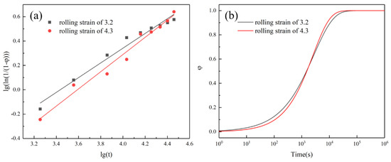 The electrical conductivity of the alloy with the rolling strains of 3.2 and 4.3 was measured at different aging times, and the corresponding value was calculated. The scatter plot of - was drawn, and linear fitting of the data was performed according to Equation (5), as shown in Figure 13a. The values of n and b are measured from the slopes and intercepts of the fitted curves. Substituting the obtained values of n and b into Equation (5), the equation of the precipitation volume fraction evolving with the aging time can be obtained, and the curve obtained is shown in Figure 13b.