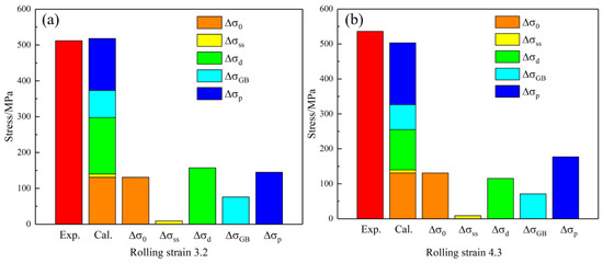 Contribution of strengthening mechanism to the strength of the Cu-Ni-Cr alloy under different rolling strains (a) 3.2; (b) 4.3.
