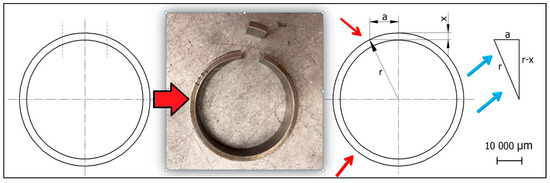 Methodology of the angled micro-section used for microhardness measurements (where: r—radius of the ringed sample, a—distance from the edge of the angled micro-section, x—distance from the edge of the perpendicular micro-section).