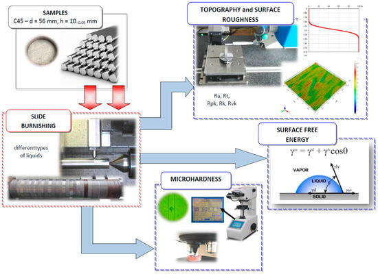 Figure 4 shows the test stands and procedures that were used to determine the properties of slide-burnished C45 steel samples with the use of various machining liquids.