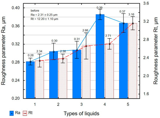 Influence of slide burnishing conducted in various media on the Ra and Rt surface roughness parameters of C45 steel samples where: 1—slide burnishing in oil+PMM+MoS2, 2—slide burnishing in oil+PMM, 3—slide burnishing in oil+MoS2, 4—slide burnishing in oil, and 5—slide burnishing in EcoEm-1 emulsion.