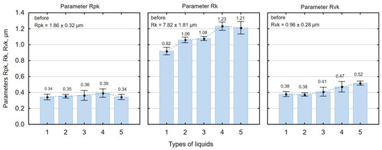 Slide burnishing also leads to changes in the parameters of the Abbott–Firestone curve (Figure 7). As a result of slide burnishing, the reduced peak height Rpk is decreased from 79% to 82%, and the depth of the surface roughness core Rk from 84% to 88%. The decrease in the Rpk parameter relative to the value after grinding is beneficial due to the wear after the lapping period of the mating parts. On the other hand, the low value of the Rk parameter allows us to conclude that there is a high load capacity of the surface after slide burnishing. As a result of surface smoothing, the Rvk parameter is decreased (reduction from 45% to 60%). This is an undesirable phenomenon due to a decrease in the lubricant retention capacity of the friction pair elements. The changes in the material bearing curve parameters are greater than those observed after slide burnishing of titanium alloy Ti6Al2Mo2Cr [72]. The lowest value of the analysed parameters Rpk, Rk, and Rvk was obtained using oil+PMM+MoS2 as a machining medium. In tribological terms, this result is the same as the results of3D shape parameters (Ssk < 0 and Sku > 3).