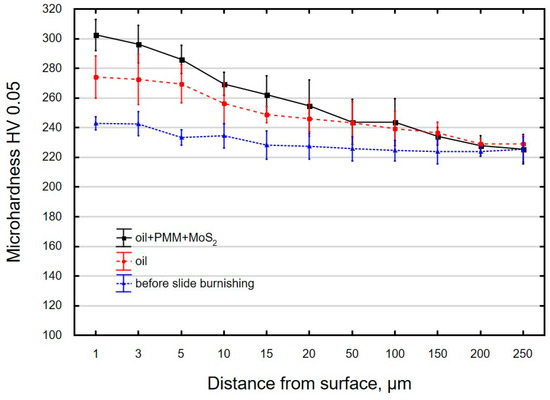Figure 9 compares the microhardness of samples burnished in different media. The highest microhardness values of HV 0.5 and HV 0.1 were obtained for the samples burnished in oil+PMM+MoS2. The presence of a surface-active additive in oil increases the rate of dislocation formation and displacement, thus leading to increased microhardness. The largest increase in microhardness was obtained for the surfaces that were slide burnished using “rich” mixtures (oil+PMM+MoS2; oil+PMM; oil+MoS2). The smallest changes in surface microhardness were obtained after slide burnishing conducted using emulsion as a cutting fluid. The obtained microhardness values of HV0.5 and HV 0.1 confirm that the presence of a surface-active additive “facilitates” plastic deformation and destruction of material cohesion. The microhardness increase is lower than that obtained after slide burnishing of X19NiCrMo4 steel [51] and X6CrNiTi18 stainless steel [22].
