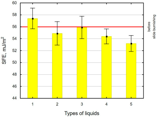 The experimental results showed that the interaction of the cutting fluid with the surface-active additives led to changes in the SFE. The presence of the surface-active additives caused the SFE to either decrease or retain a value similar to that after grinding (Figure 10). These results differ from those reported in [73,74]. The SFE reduction is conducive to the formation and movement of dislocations in the surface layer, which leads to “easier” deformation of the surface layer (the so-called Rebinder effect) [61]. For oil+PMM+MoS2, a slight increase in the SFE was observed in relation to its value after grinding. The results of SFE and surface microhardness demonstrate that for surfaces slide burnished in the medium enriched with surface-active additives, the greatest changes in the tested properties (microhardness, SFE) were obtained, which confirms the occurrence of the Rebinder effect [59].