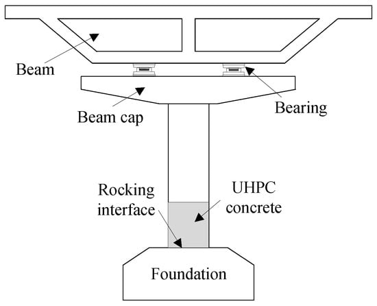 Recently, the seismic concept of rocking bridges has been applied to bridge engineering [,,,,]. In 1963, Housner [] proposed for the first time the seismic response of a structure that was weakened by the rocking of available structures during earthquakes and presented a model to analyze the rocking behavior of rigid bodies. Subsequently, the Housner rigid-body rocking model was improved, and its applicability became possible [,,,,]. Mander et al. [] conducted a quasi-static experimental study on a rocking pier with only unbonded pre-stressed steel bars and proposed a simplified calculation formula for its force–displacement relationship. Pampanin et al. [] and Palermo et al. [] proposed the combined application of built-in energy-dissipating reinforcements and unbonded pre-stressed technology to improve the energy-dissipation capacity of a rocking pier. Guo et al. [,] adopted fiber-reinforced materials and modified alloys to improve the durability of pre-stressed tendons and energy-dissipating devices in corrosive environments. At present, seismic studies on rocking piers are still in the stage of structural research and basic theoretical development. Although the advantages of the seismic toughness of rocking piers have been confirmed via experiments and numerical methods, the hysteretic and post-seismic resilience of rocking piers using new materials, such as ultra-high-performance concrete (UHPC), remain to be further studied. UHPC is a reasonable combination of an ultra-fine admixture, ultra-high-strength steel fibers, an efficient water-reducing agent, and small particle aggregates [,]. Compared with ordinary concrete, UHPC has the characteristics of high strength, ductility, and durability. The seismic damage of a rocking pier is mainly the compressive damage of the column toe (concrete at the edge of the rocking interface). The application of UHPC to the plastic hinge area of a rocking pier (as shown in Figure 1) can significantly improve the compressive bearing capacity of its column toe, which allows for the limitation of seismic damage and failure of the bridge pier to a greater degree. At present, the multi-axial spring model is widely used to simulate the hysteretic behavior of rocking piers, but it is complex to determine the stiffness of the multi-axial springs. Therefore, a simple and clear analysis model of a UHPC rocking pier needs to be developed.