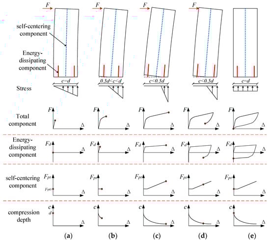 A rocking bridge pier is placed directly on the top of a bearing platform to form a rocking interface, and the bridge pier and the bearing platform are connected as a whole by an unbonded pre-stressed tendon and an energy-dissipating device. As shown in Figure 2, under the action of an earthquake, the rocking pier, as the main compression member, is lifted and closed on the cap. Therefore, the plastic deformation of the pier is concentrated on the rocking interface, avoiding damage to the pier body. The rocking of the pier causes the unbonded pre-stressed tendon and the energy-dissipating device to provide the functions of self-centering and dissipation of seismic energy, respectively. The bending moments applied by the energy-dissipating and self-centering components and the height of the compression zone on the rocking interface change with the change in the rotation angle of the rocking interface during the deformation of the rocking pier. The bending moment–rotation and height of the compression zone in a typical deformation process are shown in Figure 2.