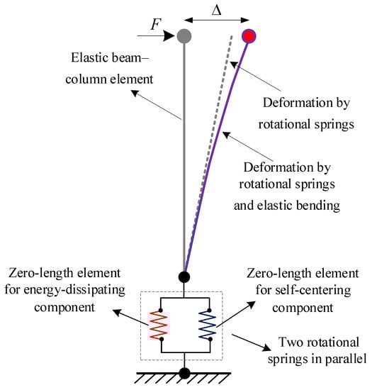 A lumped plasticity model as shown in Figure 3 is built using the OpenSees finite element analysis platform (Version 2.2.2). An elastic beam-column element is applied to simulate the lateral elastic stiffness of the pier. Two zero-length elements are used to simulate the moment-rotation hysteretic behaviors of the self-centering component and the energy-dissipating component, respectively. Then, the two zero-length elements are connected in parallel to the elastic beam-column element. The moment-rotation hysteretic behavior of the self-centering component is simulated using the ElasticMultiLinear material model. The moment-rotation hysteretic behavior of the energy-dissipating component is simulated using the RambergOsgoodSteel material model. Based on the mechanical mechanism, the moment-rotation hysteretic behaviors of the self-centering component and energy-dissipating component can be obtained using the deformation mode. In addition, the compression depth of the rocking pier and the rotation can be calculated using an iterative method proposed in the literature [].
