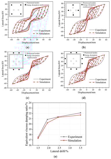 Comparisons between the experimental and simulated results of the hysteretic curves. (a) Hysteretic curves of HBD1, (b) Hysteretic curves of HBD2, (c) Hysteretic curves of HBD4, (d) Hysteretic curves of HBD5, (e) Equivalent viscous damping ratio of HBD1.