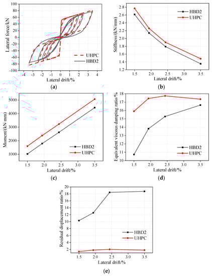 In this study, the residual displacement ratio is used to quantitatively examine the self-centering ability of the specimens. A large residual displacement ratio implies a poor self-centering ability. As shown in Figure 5e, under a drift rate of 2.4%, the residual displacement ratios of HBD2 and UHPC are 2.0% and 18.4%, respectively. Therefore, UHPC has a small residual displacement ratio and good self-centering ability.