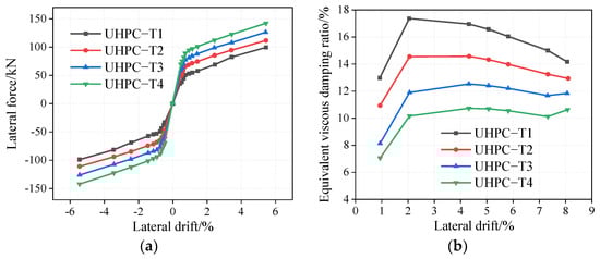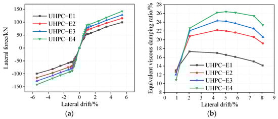 The reinforcement diameters of the rocking bridge pier specimens UHPC-E1, UHPC-E2, UHPC-E3, and UHPC-E4 are 12.5 mm, 16 mm, 18 mm, and 20 mm, respectively. The corresponding steel reinforcement ratios are 0.40%, 0.66%, 0.83%, and 1.03%. As shown in Figure 6a, with an increase in the energy consumption steel reinforcement ratio, the UHPC rocking lateral bearing capacity of the bridge pier increases. For example, under a drift rate of 5.44%, as the energy consumption steel reinforcement ratio increases from 0.40% to 1.03%, the lateral force increases by 43.43%. Before yielding, the pier is in the elastic stage, the slope of the curve increases gradually, and the initial stiffness increases gradually. After yielding, the curve slope is basically the same; therefore, the stiffness of the UHPC rocking pier is basically the same. As shown in Figure 6b, with an increase in the steel reinforcement ratio of the energy-dissipating steel bar, under the same drift, the energy consumption and equivalent viscous damping ratio of the bridge pier are remarkably improved. For example, at a drift rate of 4.31%, the equivalent viscous damping ratio increases by 5.22% when the reinforcement ratio of the energy-dissipating bar increases from 0.40% to 0.66%.