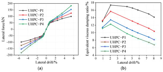 The pre-stressed tendon areas of the rocking pier specimens UHPC-P1, UHPC-P2, UHPC-P3, and UHPC-P4 are 99 mm2, 198 mm2, 297 mm2, and 396 mm2, respectively. The corresponding ratios of the pre-stressed tendons are 0.32%, 0.65%, 0.97%, and 1.29%. As shown in Figure 8a, with an increase in the pre-stress reinforcement ratio, the lateral bearing capacity of the UHPC rocking bridge pier increases. For example, under a drift rate of 5.44%, when the pre-stressed tendon ratio increases from 0.32% to 1.29%, the lateral force increases by 83.84%. Before yielding, the bridge pier is in the elastic stage, and the curve slope and the initial stiffness are basically unchanged. The slope of the curve increases gradually after yielding; therefore, the stiffness of the UHPC rocking pier increases gradually after yielding. As shown in Figure 8b, with an increase in the pre-stress reinforcement ratio, under the same drift ratio, the equivalent viscous damping ratios of the UHPC rocking bridge piers are significantly reduced. For example, at a drift rate of 5.81%, the equivalent viscous damping ratio decreases from 16.02% to 8.46% when the reinforcement ratio increases from 0.32% to 1.29%.