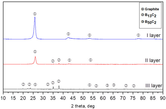 Three types of layers differing in color were distinguished optically in the bed after synthesis. Therefore, each layer was separately subjected to the X-ray diffraction analysis. Layer 1 was located on the top of the crucibles; below this was layer 2, while layer 3 was located at the bottom of the crucibles. The X-ray diffraction analysis revealed that the powder from layer 1 was composed of one-phase graphite (ICSD 98-007-6767), obtained after being synthesized from soot. Powder from layer 2 was composed of a two-phase rhombohedral boron carbide with a stoichiometry close to B13C2 (ICSD 98-061-2568) and a small amount of graphite. The obtained powders from layer 3 were composed of three phases: the rhombohedral phase of boron carbide with a stoichiometry close to B13C2, the tetragonal B48(B2C2) phase, and a small amount of graphite-like carbon less than 1%. At each temperature, we obtained three layers after boron carbide synthesis. The biggest difference is the contents between the rhombohedral phase of boron carbide B13C2 and the tetragonal B48(B2C2) (ICSD 98-000-9734) phase (Figure 2).