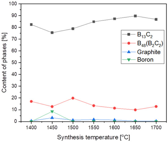 The highest structure stability, and hence the highest melting point, demonstrated the boron carbide with B13C2 stoichiometry corresponding to 13.3 at. % of carbon. As the synthesis temperature increased, the synthesis product tried to reach the highest structure and achieved this at 1650 °C (Figure 3) with the biggest phase of B13C2, with no particle growth. Already at 1700 °C, there was a significant growth of nanoparticles, from 13.4 nm at 1650 °C to 41 nm at 1700 °C. (Table 1).