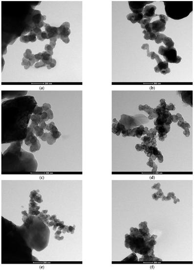 The SEM and TEM observations of the synthesized powders (Figure 4 and Figure 5) supported crystallite morphology determined by the XRD analysis (Figure 6) and also revealed strong aggregation of the primary particles. The SEM and TEM microphotographs (Figure 4 and Figure 5) confirmed the narrow particle size distribution.