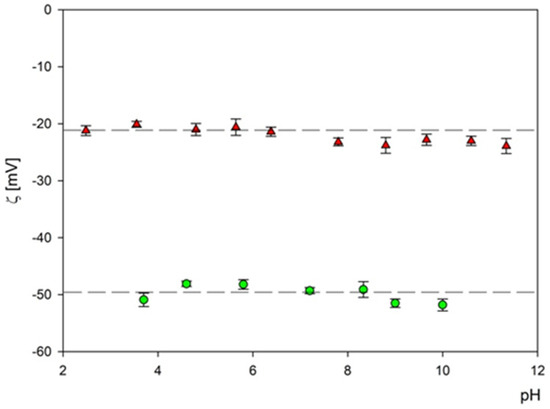 The dependence of the zeta potential of boron carbide nanoparticles on pH at an ionic strength of 10−3 M for fraction 1 (▲)—and fraction 2 (●). The dash lines are the linear fits of experimental data.