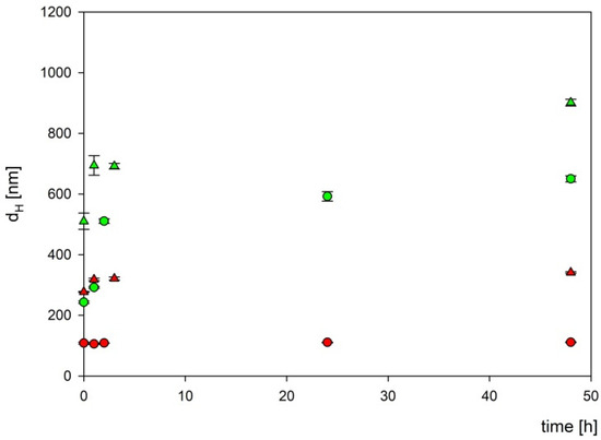 The dependencies of the hydrodynamic diameter of B4C nanoparticles on incubation time. The points denote experimental results obtained for fraction 1 (●), fraction 2 (▲), DMEM (red color), and RPMI (green color). The B4C bulk concentration was equal to 1000 mg L−1.