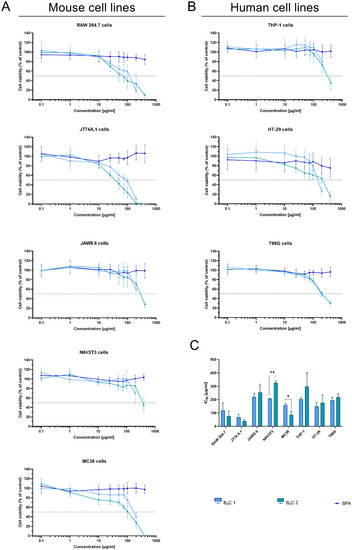 Effect of boron carbide preparations on cell proliferation. The viability of (A) mouse cells (RAW 264.7, J774A.1, JAWS II, NIH/3T3, MC38) and (B) human cells (THP-1, HT-29, T98G) after 72 h of exposure to boron carbide compounds (B4C 1 and B4C 2) and BPA was assessed using the MTT assay. Graphs represent the percentage of viable cells relative to control cells (control = 100%). (C) Concentrations of B4C 1 and B4C 2 causing 50% inhibition of cell proliferation (IC50) calculated for each cell line. Results are expressed as means ± SD calculated for three independent experiments performed in triplicate. The differences between groups were calculated using multiple unpaired t-tests (* p < 0.05; ** p < 0.01).