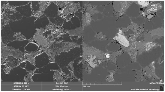 The rock mass of the test was sandstone, and the mineral composition was identified as a purplish-red, greyish feldspathic quartz medium sandstone. The sandstone is of massive formation, internally supported by grains in point-line contact. The components are in contact cementation with each other and the cement is calcite, which is a carbonate. The particle size of the granular material is about 0.26–0.5 mm, and the density is in the range of 2.60~2.63 g/cm3. The rounding is sub-prismatic-sub-rounded, and the sorting is medium. It mainly consists of feldspar, calcite and quartz, with about 30% feldspar, 35% quartz and 35% calcite particles. The structural image is shown in Figure 1: