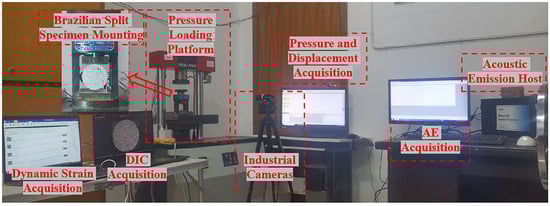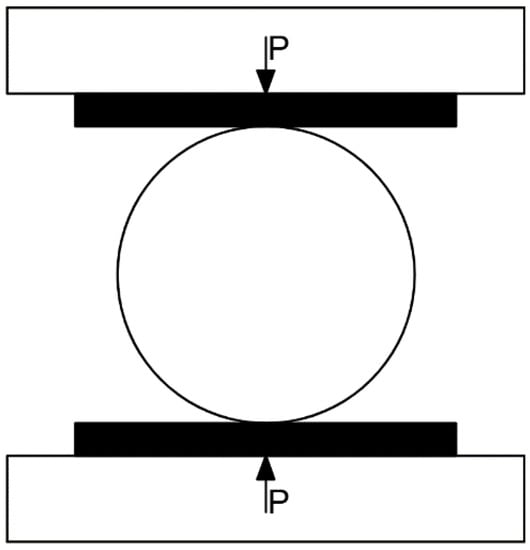 There are four Brazilian splitting test methods [30,31,32]. However, the upper and lower curved steel plates (ISRM) are very harsh on specimen size. On the other hand, the “steel plate–thin iron bar–specimen” method (domestic rock mechanics test specification) has an effect on the acoustic emission test with the thin iron wire [33]. In this test, the direct pressure method adopted by Liu et al. [34] was chosen, which is also commonly used in mining sector specifications [35]. In addition, He et al. [36] showed the rock tensile strength values obtained from direct and arc loading are very close to each other. The schematic diagram of the platform method Brazilian splitting test is shown in Figure 4.