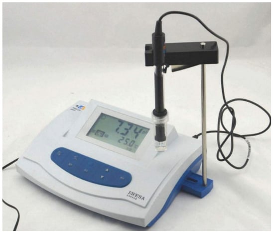 Due to the complex and variable tunnel water chemistry environment, coupled with the long and slow water-rock interaction time. In order to observe the chemical corrosion changes in a short period of time without departing from the actual working conditions, this test used the Yunnan Dengloushan Mountain Tunnel site solution (pH = 7.68) as the substrate fluid. The basal solution was added with hydrochloric acid and sodium hydroxide solution to formulate chemical solutions with different respective pH values. The solution pH values were set into four gradients of 2, 5, 7.68 and 11, plus the natural state for a total of five working conditions. The configuration process was carried out by titration and the solution pH during titration was tested using an acidometer. Figure 3 below shows the pH audiometer.