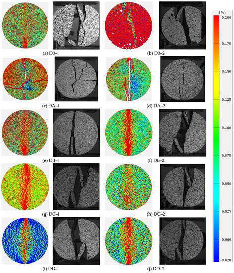 - Xu, J.P.; Dong, X.L.; Fu, Y.Q.; Yu, X.F.; Zhou, F.H. Dic experimental analysis of the splitting process and strength of concrete Brazil under different loading boundaries. Acta Mech. Sin. 2020, 52, 864–876. [Google Scholar] [CrossRef]