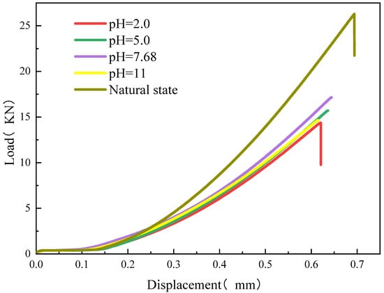 The curves of tensile strength of the specimens after immersion in different pH solutions as a function of the pH of the immersion solution are shown in Figure 7. The results show a trend of weak alkali (pH = 7.68) > weak acid (pH = 5) > strong alkali (pH = 11) > strong acid (pH = 2). The greatest deterioration was in the rock samples after immersion in the chemical solution of strong acid (pH = 2), where the decrease in tensile strength was 43.62%. Furthermore, when compared to the natural state, the tensile strength of the rock decreased by 40.02%, 35% and 22.96% for sandstones with a pH of 11, 5 and 7.68, respectively. Due to the non-homogeneity of the rock material, the tensile strength of each tested rock sample has a certain degree of dispersion. However, the average tensile strength increases with the increase of the pH of the soaking solution. When the pH of the solution exceeds a certain threshold, the tensile strength of the rock samples decreases with the increase of the pH of the soaking solution. The threshold value depends mainly on the conditions under which the internal constituents of the sandstone react with the ions and other substances inside the solution.