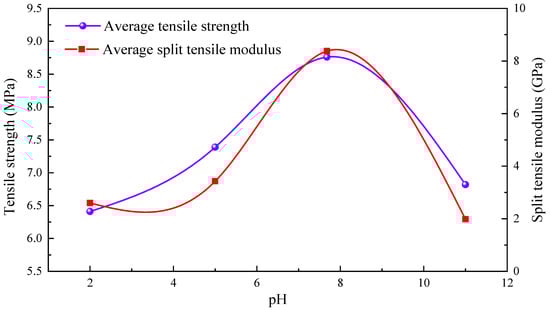 As shown in Figure 7, the average value of instantaneous splitting modulus varies with the pH of the immersion solution at different pHs of the chemical solution. The change curves of splitting modulus and rock tensile strength have the same trend. The split tensile modulus of the rock samples firstly increases with the increase of the pH of the soaking solution and then decreases with the increase of the pH of the soaking solution when the pH of the solution exceeds a certain threshold value.