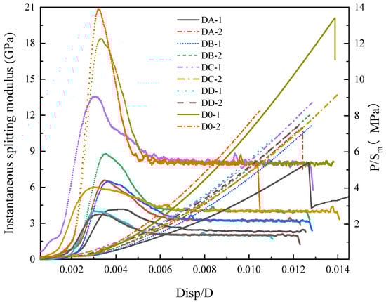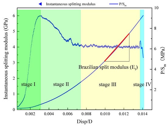 The splitting tensile modulus depicts the relationship between deformation and load during the rock-splitting loading process. There are two methods for computing this modulus: (1) Stick strain gauges at the center perpendicular to the loading direction and solve for the tensile modulus of the rock by using the measured strain values [44,45]; (2) Yu [46] proposed a magnitude analysis method to define the splitting modulus. In this method, the vertical displacement curve is divided by the value of the rock’s radial surface (P/Sm), while the horizontal coordinate value is divided by the diameter of the specimen (Disp/D). The resulting curve has the same shape as the load-vertical displacement curve, and the slope of the straight line segment represents the modulus of cleavage. In this study, the magnitude analysis method is utilized to calculate the splitting modulus of sandstone.