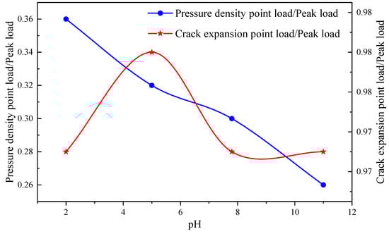 From Figure 10, the solution pH affects the pressure-tightening point of sandstone Brazilian splitting. The pressure-tightening point to peak load ratio of sandstone gets smaller as the pH increases. However, this compaction load is between 22% and 36% of the peak load. This result is consistent with the theoretical results of stress threshold prediction for the compaction point in uniaxial compressive stress-strain curves obtained from the literature. However, the crack extension point load corresponding to the end of the elastic phase is about 98% of the peak load. The result differs from the theoretical value of the crack extension stress threshold prediction in the stress-strain curve of uniaxial compression. This is mainly due to the low tensile damage strength and the fact that tensile damage is brittle, which can lead to a higher load at the crack initiation point.
