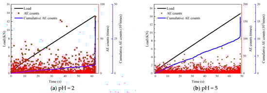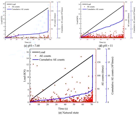The acoustic emission [47] technique is used to monitor cracks and can infer crack closure, extension and spreading. Changes in the acoustic emission signal are important indicators for analyzing the evolution of damage within the structure during rock cracking and destruction. In this study, the acoustic emission characteristics under tensile loading after water chemical solution erosion were tested and analyzed. The number of acoustic emission events (referred to as the ringing AE event number) and the cumulative acoustic emission ringing counts, which indicate the degree of damage, were selected for investigation. The intrinsic relationship between the acoustic emission signals and rock damage is explored by analyzing the change pattern over time.
