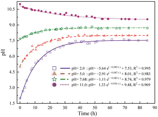 The rate and magnitude of change in pH of the sandstone leach solution at different pH solutions are shown in Figure 12. The pH index decay function of the exponential level of the rate of decrease is different, in which the relative magnitude of the rate of decay is strong alkaline (pH = 11.0) < strong acidic (pH = 2.0) < weakly acidic (pH = 5.0) < weakly alkaline (pH = 7.68); the change of the solution pH within 30 h. The relative magnitude of the changes in solution pH within 30 h was strongly acidic (pH = 2.0) > weakly acidic (pH = 5.0) > strongly basic (pH = 11.0) > weakly basic (pH = 7.68). Among them, under the environment of different pH solutions, different sandstone compositions and reaction rates of dissolution reaction lead to different pH and pH change rates of the final solution.