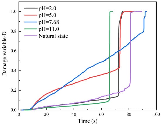 Figure 13 represents the evolution curves of damage caused by chemical corrosion and loading at different pH values. The damage curves under the action of different pH chemical solutions differ greatly in time. In the initial stage of Brazilian splitting action, a large number of pores produced by chemical corrosion were compacted. The duration of the compacting stage was greater for weak bases than for strong bases, and greater for weak acids than for strong acids. This is most likely because the rock samples under strong acid and a strong base were damaged to a greater extent.