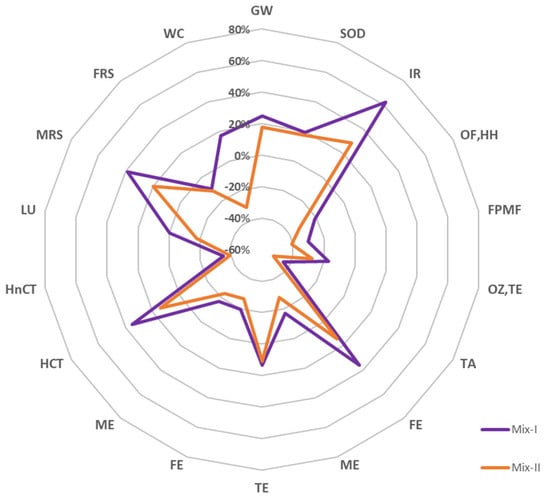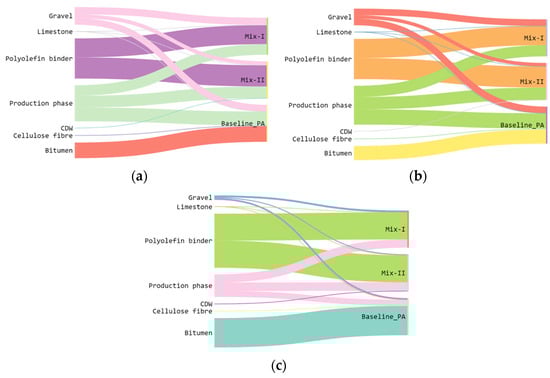 As other studies have already proved, the most environmentally detrimental process is the one connected to the bitumen [47,48,49]. Looking at the results of this study, it is possible to see that at midpoint level, Mix-I, which is composed of virgin aggregates, has a higher impact with respect to the baseline scenario for at least 50% of the impact categories analysed. This is mainly due to the composition of the polyolefin-based synthetic transparent binder. The innovative binder is not bitumen-based but some of its constituents are polymers and oils that are fossil fuel-based. This leads to high impact, especially looking at the indicators such as global warming, stratospheric ozone depletion, and ionizing radiation. Furthermore, almost 50% of its constituent materials undertake a long journey before arriving at the production plant and this highly affects the impact connected to the production of the binder. All these statements are well represented in Figure 5, where the contributions at the endpoint level of the polyolefin-based synthetic transparent binder and of the bitumen are evident. The Sankey diagrams reported in Figure 5 represent the contribution of each mixture’s constituents for the three damage categories analysed. On the other hand, thanks to the use of CDW aggregates, it is possible to view important changes in the analysis. In all the endpoint values, the mixture containing the CDW aggregates observe lower results if compared with the other mixtures, which is in line with the findings of other studies [35,50]. It is certain that all the midpoint categories show results lower than their virgin counterpart. However, some categories are still higher than the baseline scenario, and this is associated with the production process of the polyolefin-based synthetic transparent binder.