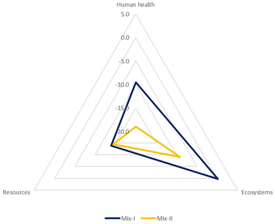 Sankey diagram for the sub-process contribution of Mix-I, Mix-II, and baseline scenario to the damage categories of (a) human health, (b) the ecosystem, and (c) resources.