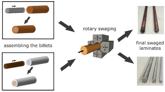 The presented study investigated the effects of room temperature rotary swaging on Al/Cu laminates of two designs—Al sheath and Cu wires and Cu sheath and Al wires. The results of the study (provided as bullet points) can be summarized as follows: