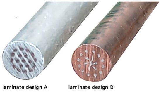 Figure 2 shows photos of the final swaged laminates of both the designs. The figure clearly shows that the behavior of the inserted wires was different within both the laminates, especially with regard to the axial wire and the internal layer of wires (see that these Al wires within laminate B were deformed more than those within laminate A). This can be primarily correlated with the acquired results of mechanical properties of both the laminates and the character of the swaging process, i.e., plastic flow of the material during swaging, as further discussed in Section 4.