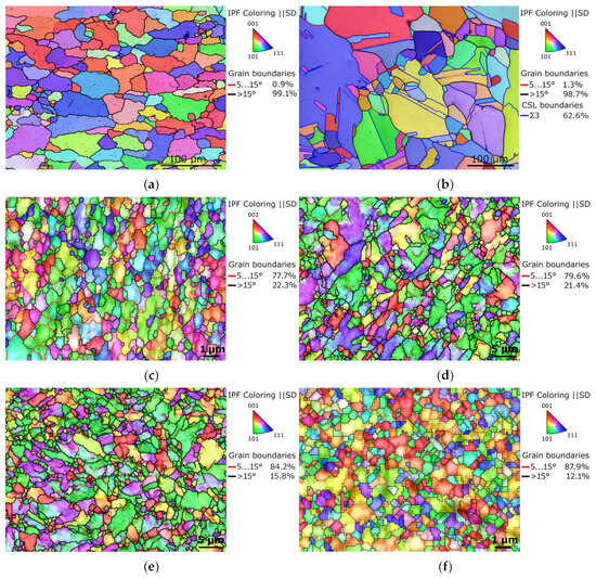 The orientation image maps (OIM), depicting the microstructures of the metallic components from which the billets were assembled, are shown in Figure 3a,b. The maps also depict the LAGB and HAGB fractions, as well as <111> 60°, i.e., Ʃ3 coincidence site lattice (CSL), and twin boundaries (for the Cu). The microstructures of both the original metals evidently featured coarse recrystallized grains having no prevailing preferential orientation. The original Al featured the majority of HAGBs, and so did the original Cu, which also exhibited a substantial presence of recrystallization twins (62.6% of HAGBs were of the Ʃ3 type). The average grain size, evaluated via the maximum Feret diameter parameter [69], was 63.9 µm for the Al, and 36.3 µm for the Cu.