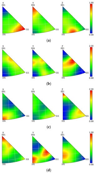 The mapping of grains orientations within the components of the swaged laminates (Figure 3c–f) showed that the grains did not feature any prevailing preferential orientation in general, i.e., the colors in the OIM images were more or less random. In order to document this statement with a greater reliability, texture analyses via inverse pole figures (IPF) were performed. The IPF images depicting preferential texture fibers within the Al and Cu components of both the laminates are shown in Figure 4a–d. As can be seen, the texture intensities were low, which corresponds to the above-presented OIM data; the maximum intensity of up to 2.3 × random was observed for both the Cu components of the laminates, while the maximum texture intensity of the Al components of both the laminates was lower than 2 × random. The observed preferential texture orientations differed slightly, most probably in accordance with the level of occurring restoration processes, which will be further discussed in Section 4.