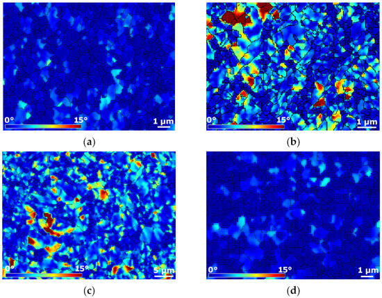The internal grains misorientations in the scale from 0° to 15° pointing to the presence of residual stress within the microstructures of Al and Cu components of the swaged laminates are shown in Figure 5a–d (microstructure locations correspond to those depicted in Figure 3c–f). The results of the analyses revealed that the presence of internal misorientations within the microstructure of Al sheath of laminate A was scarce (Figure 5a), and so was their presence within the Al wires of laminate B (Figure 5d). On the other hand, a significant portion of the grains within the microstructures of the Cu components of both the swaged laminates exhibited the presence of (high) misorientations pointing to the occurrence of residual stress, which was most probably related to the plastic flow during processing, and development of substructure within these grains, as further discussed.
