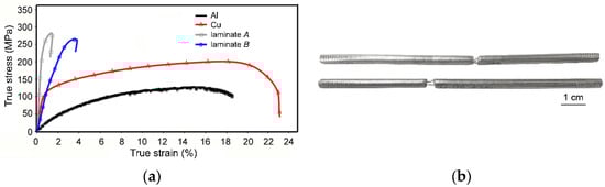 The stress–strain curves originating from the tensile tests of the original metallic components, as well as both the swaged laminates, are shown in Figure 6a. As can be seen from the acquired results, both the laminate designs exhibited comparable UTS values, but the plasticity of the laminates differed. The elongation to failure for laminate B, featuring a dominant volume fraction of Cu, was ~3.5%. On the other hand, for laminate A, featuring a dominant volume fraction of Al, the elongation to failure was less than 1%. Figure 6a shows that the stress–strain curve acquired for laminate A featured a steep increase from the very beginning of loading. In other words, laminate A exhibited substantial work hardening. This is documented also by Figure 6b showing the specimens of laminate A after testing; the specimens evidently show very negligible necking before fracture. Laminate B also exhibited work hardening, as can be seen from the rapidly increasing true stress, but its intensity was not as high as for laminate A.