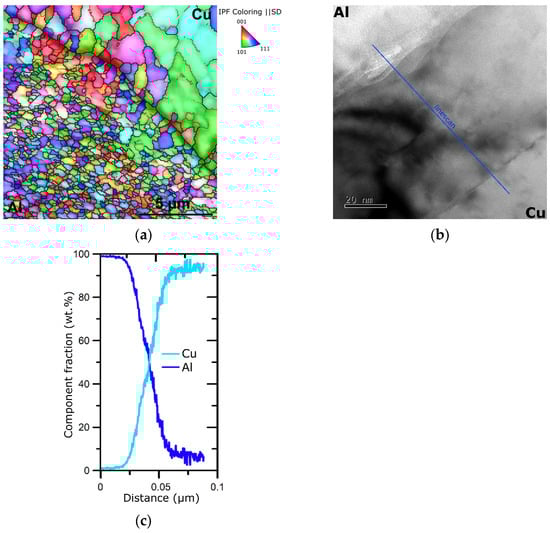 OIM image depicting Al wire/Cu sheath interface of laminate design B (a); TEM scan of the interface depicting high-quality mechanical bonding of Al and Cu (b); chemical composition of interface measured along the linescan depicted in Figure 6b (c).