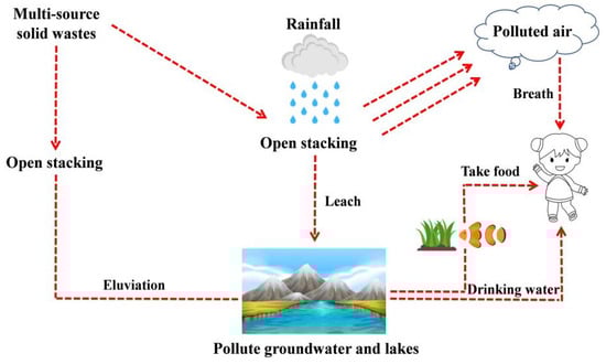 With the continuous improvement of urbanization construction, the vigorous development of the iron and steel industry and coal-fired power generation in China, substantial multi-source solid wastes (MSSWs) are engendered, such as recycled crushed stone (RCS), steel slag (SS), silicon manganese slag (SMS), and fly ash (FA). By 2022, the comprehensive utilization rate of RCS was less than 12%, and the comprehensive utilization rate of industrial solid wastes was only 16% in the Ningxia Autonomous Region of China, which was not by a large difference from developed regions such as North America and Europe. The investigations demonstrated that forging 1 t of steel will form about 0.13 t of steel slag [], making 1 t of manganese will produce about 10 t of silico-manganese slag [,], generating per trillion kW·h of power will emerge about 0.7 × 109 t fly ash [,]. As the principal energy development province in China, Ningxia has a critical accumulation of MSSW. Under the leaching of precipitation, it significantly attacks the local ecological environment, land resources, and felicitous life of people [,,]. The contaminant cycle process of the MSSW is introduced in Figure 1. In order to accomplish the target of high-quality development of material–environment–economy, prominent scholars at home and abroad have carried out the research wave of manufacturing concrete with high performance, low carbon emissions [,], and hoisting the utilization rate of MSSW.