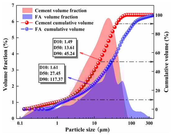 SS was generated from the converter steel slag of the Zhizhong Industrial Solid Waste Disposal Company, Yinchuan, Ningxia, China. The volume stability by the test was qualified, the density was 3.15 g·cm−3, the water absorption rate was 1.86%, and the crushing value was 18.6%. SMS was supplied by SMS Factory in Ningxia, China, with a water absorption of 2.54% and density of 3.76 g·cm−3. RCS was obtained from Yinchuan, Ningxia, China, with a density of 3.04 g·cm−3, water absorption of 1.98%, and crushing value of 21.7%. When measuring the water absorption of SS, SMS, and RCS, the soaking time is the same for 24 h []. The cement was ordinary Portland P.O 42.5. FA was derived from the Xixia Thermal Power Plant in Yinchuan, Ningxia, China, with a specific surface area of 372.6 m2·kg−1. The particle size distribution of cement and FA was acquired by laser particle size detector (the detection range: 0.017–2000 μm, Mastersizer30000303081002, Malvern Company, Malvern, UK), which is displayed in Figure 2. An X-ray fluorescence analyzer (the analyzable elements: 11Na to 92U, S2RANGER LE03040428, AXS, Bruker, Karlsruhe, Germany) was conducted to detect the chemical compositions of raw materials, and the results are listed in Table 1. The main performance indexes of cement are summarized in Table 2.