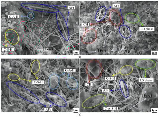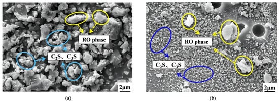 - The results of XRD demonstrated that cementitious products such as C-S-H and AFt increased with the extension of curing age. The hydration of CaO in SS and SMS led to a substantial increase in the peak value of Ca(OH)2 of the mixture at 28 days. The RO phase mainly presented the deposition platform for hydration products. SEM characterization results indicated that the crystallinity of C-S-H and AFt in the mixture system increased dramatically. The microstructure eventually transformed into a dense association from a three-dimensional network structure with many holes and cracks.