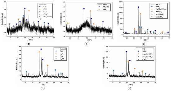 Mineral compositions of raw materials: (a) SS, (b) SMS, (c) RCS, (d) cement, (e) FA.