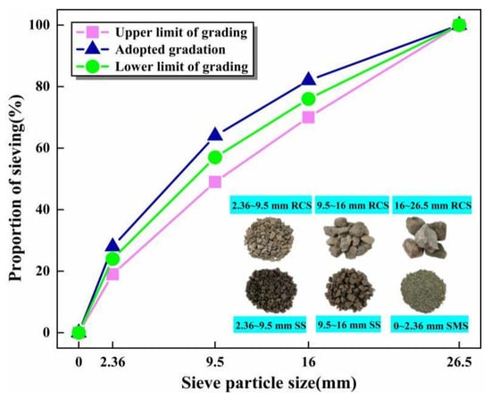 According to the gradation range of the standard (JTG/TF20-2015) [], the median value of gradation was applied as the synthetic gradation of SS, SMS, and RCS. The comprehensive screening results of SS, SMS and RCS are exhibited in Figure 5. In the materials stabilized by cement and FA, the cement content of greater than 7% will not be conducive to economic benefits, and the cement content of less than 3% will be challenging to meet the requirements of road performance, demonstrating the cement content should be in the range of 3–7%. Moreover, Naceri et al. [] and Thi et al. [] have manifested that when the ratio of cement to FA was maintained between 1:3 and 1:5 and the FA content was between 10% and 20%, the pavement base mixture had superior mechanical properties. When the SMS content is 20%, the mechanical properties of the admixture in 7 days are equivalent to the reference group and the mechanical properties in 28 days are better than the reference group []. Combined with the pre-test, engineering experience, and specification requirements, the total content of cement and FA in the designed mixture was 20%, and the cement contents were 2%, 3%, 4%, and 5%, respectively. Due to the different places of production and environment, SS of 2.36–9.5 mm and 9.5–16 mm were used to substitute the RCS of the corresponding particle size in the test. According to the total proportion of 100% in the mixture, the mass proportion of SS and RCS can be obtained by conversion under different SS replacement rates (0%, 30%, 60%, and 90%), and the total proportion of both in the mixture was 41.6%. The replacement rates of SS were 0, 30%, 60%, and 90%, respectively. In addition, SMS and RCS were adopted as the composite aggregate of 0–2.36 mm and 16–26.5 mm particle size, respectively, accounting for 19.2% of each part. The ratio of mixtures designed are illustrated in Table 3.