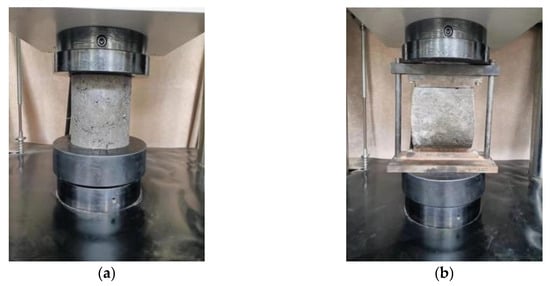 The UCS and ITS tests were carried out on the specimens at 7, 28, 56, and 90 days of curing ages according to the standard (JTGE51-2009). The tests were conducted on the microcomputer-controlled electro-hydraulic servo universal testing machine (The loading speed: 1 mm·min−1, the maximum load pressure: 1000 kN, SHT 4106, Shanghai New think twice development company, Shanghai, China). The number of specimens in each ratio was more than 13, and the average value of test results were calculated. The UCS and ITS tests are exhibited in Figure 7.
